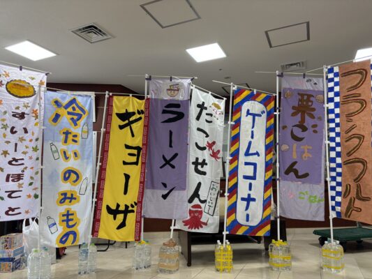 秋の味覚や屋台メニューが勢ぞろい🌞屋台の前には職員手作りののぼり旗が飾られ、