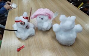 職員も一緒になって雪だるまを作っています。「冷たい」といいながらも楽しかったですよ。出来あがりがこちらです。