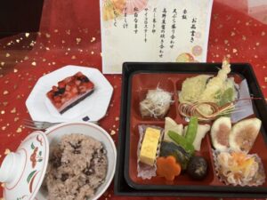 本日は、敬老祝賀会が盛大に行われ、昼食に松花堂に詰めたお祝い膳を提供させていただきました。